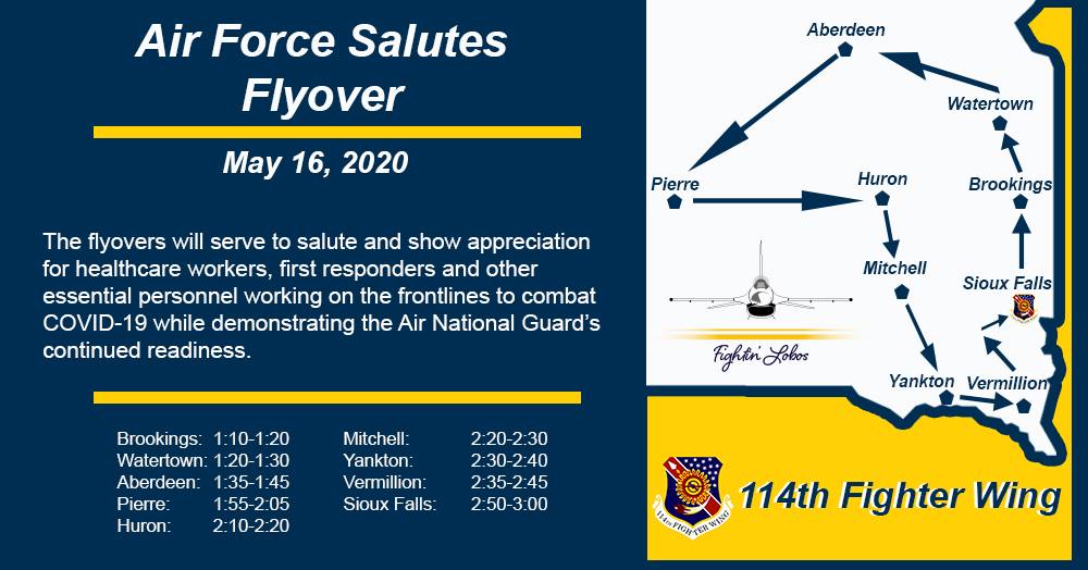 The 114th Fighter Wing will conduct flyovers across nine different communities to honor fellow Americans working to fight the coronavirus on May 16.