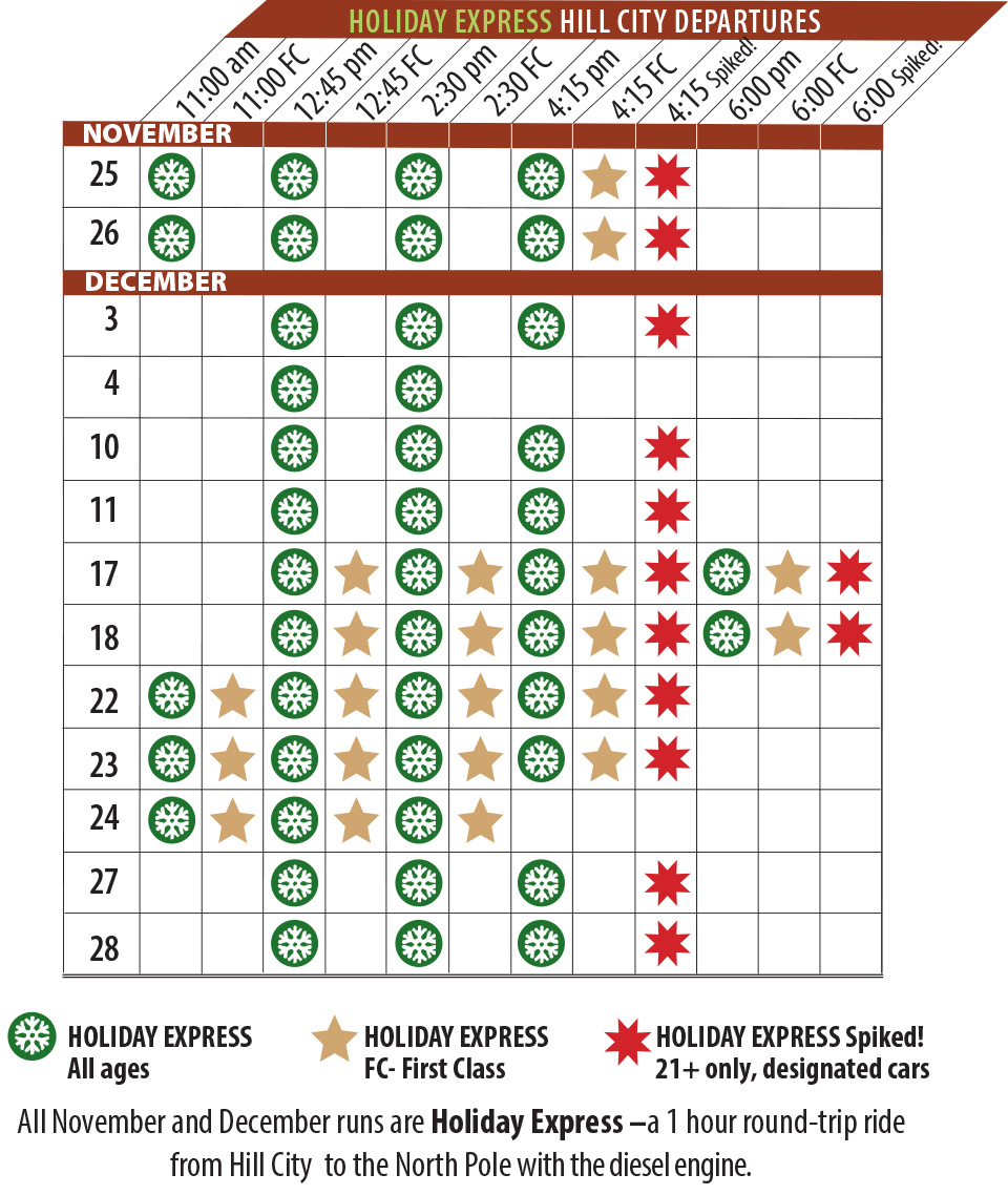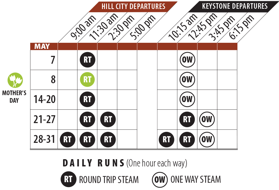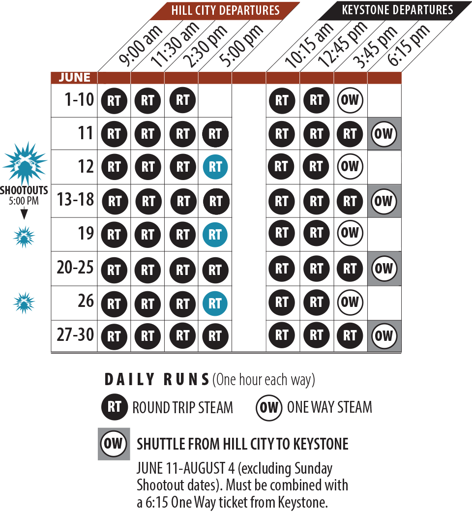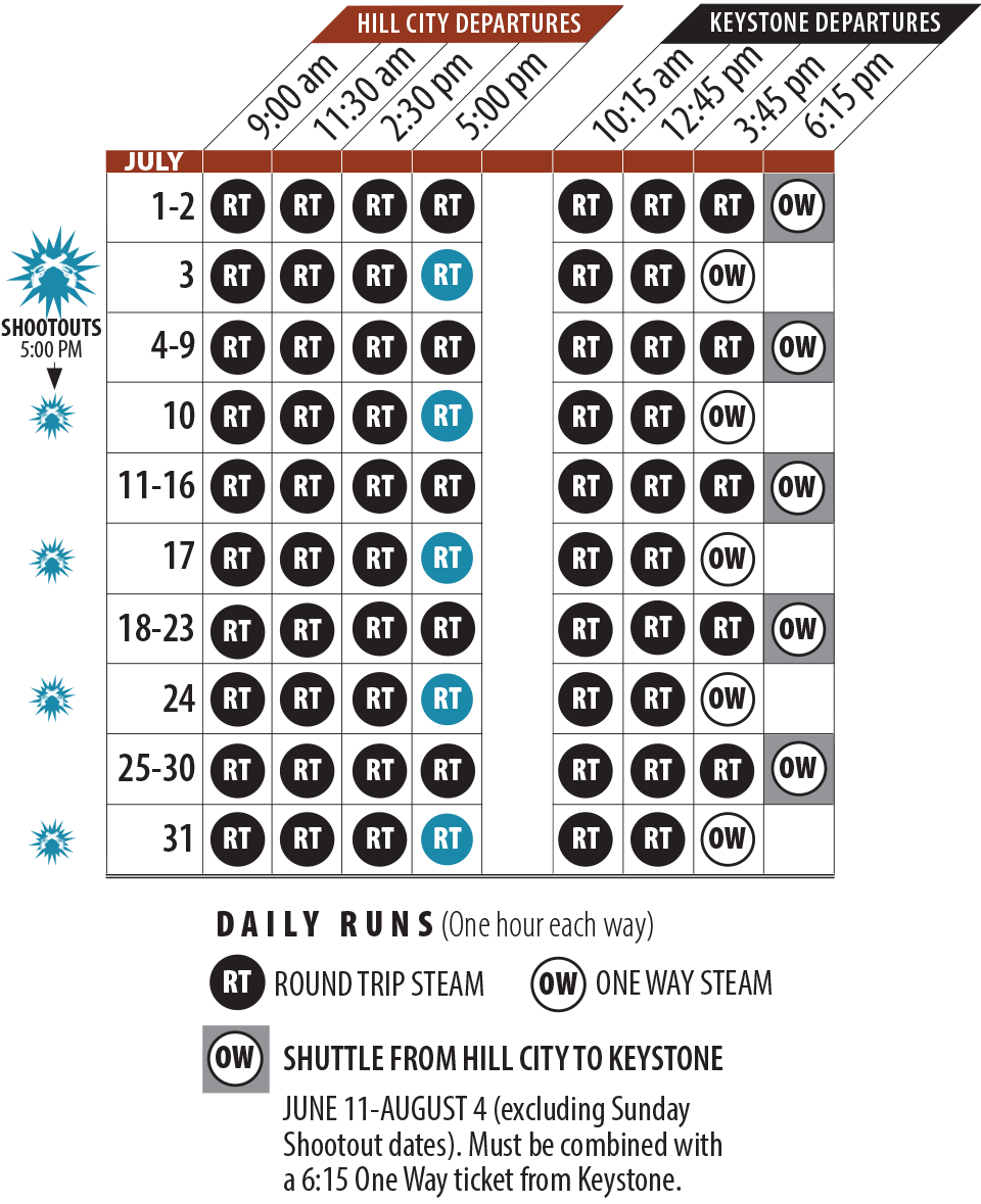The timetable below depicts the round-trip and one-way departure options available from Hill City and Keystone. Plan your ride by cross-referencing the date on the left with the available departure and return times in the table. Trains run roughly every 2-1/2 hours.