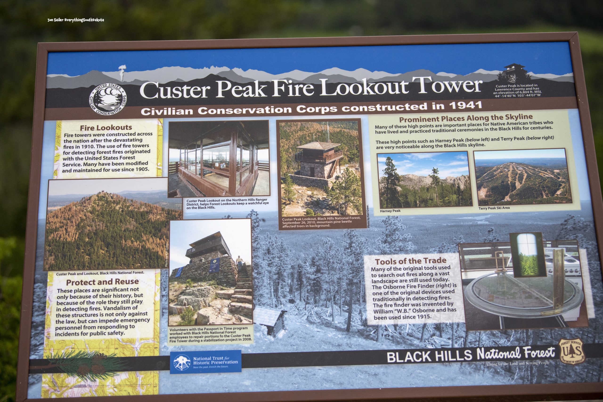 The structure was designed by architect William Ellis Groben. He was the office architect for the U.S. Forest Service from 1933-1953. The cab is 14 ft. by 14 ft. surrounded by a catwalk. Originally, the tower had a telephone line that ran between Custer Peak and the Bull Dog Ranch.