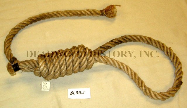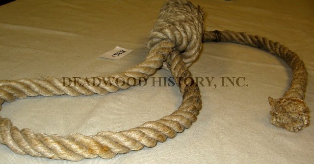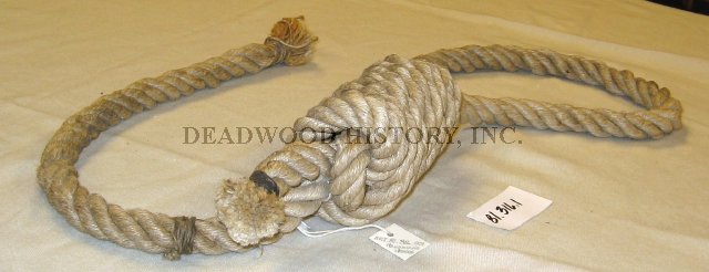 Noose is made of beige rope, with frayed ends and bound with wrapped wire or thin cord. This noose was used to hang Isadore Cavanaugh (also known as Charles Brown) on July 14, 1897 for the murder of Mrs. Emma Stone, wife of Colonel L.P. Stone.