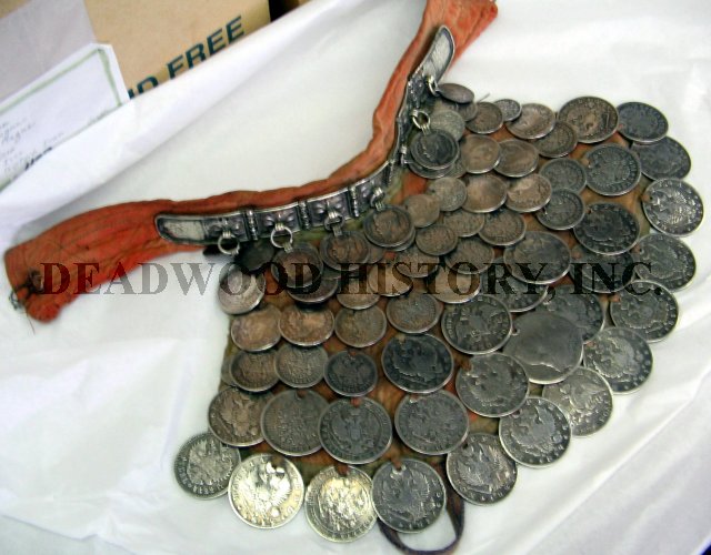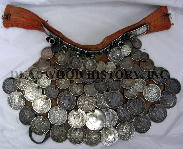 Decorative neckpiece of faded red quilted strips of fabric with a hook and eye closure. Coins dating from 1812 to 1901 are sewn to fan-shaped quilted fabric. The coins are in slightly overlapping rows. The top row of coins attaches to silver colored metal plates on the red fabric by rings. Engraved on one of the plates is “1906 / 204”.