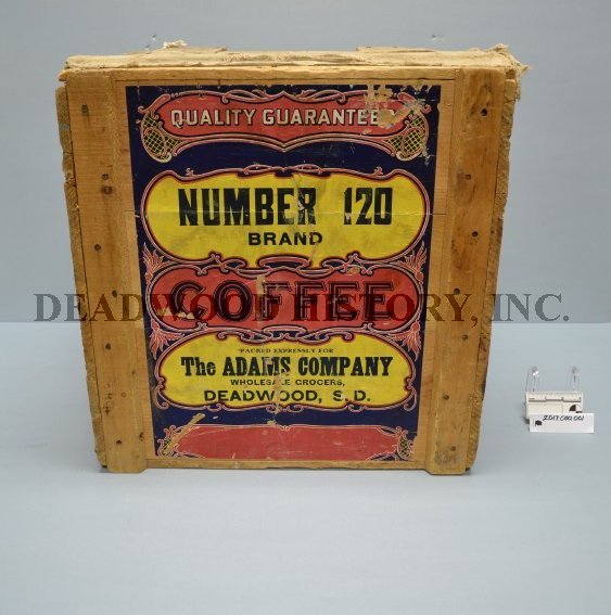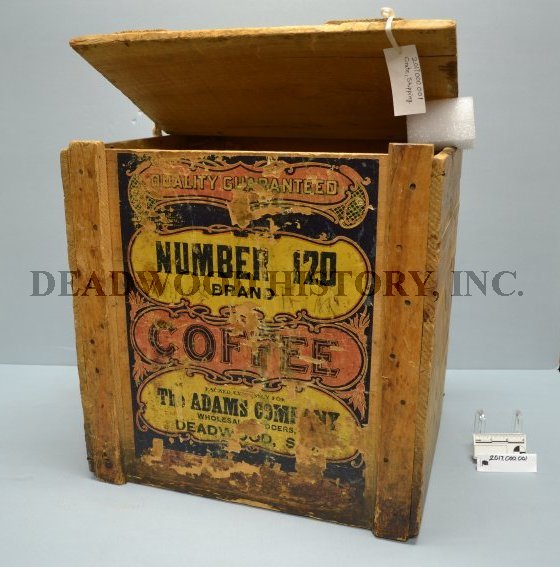 Rectangular solid shape made of tongue and groove wood planks. Top has larger section of wood plank forming a lid with two perpendicular supports across top that end with two small hinges near back. Hinges and joint covered in plain cotton fabric scrap. Top center has a rectangular white label which partially reads, “ONE POUND NET WEIGHT / NUMBER 120 / PREFERRED STOCK BRAND / COFFEE / THE ADAMS COMPANY / DEADWOOD, S.D.”. Written over top in black is,”XMAS Decorations”. The front and back have larger full size labels in red, yellow, and blue. Text on labels reads, “QUALITY GUARANTEED / NUMBER 120 / BRAND / COFFEE / PACKED EXPRESSLY FOR / The ADAMS COMPANY / WHOLESALE GROCERS, / DEADWOOD, S.D.”. One label has black colored pencil writing reads, “XMAS / Trim”. One side stamped with black stencil writing reading, “THE ADAMS CO / DEADWOOD S. DAK.” which is crossed out and upside down writing reading, “.W. CRAWFORD / ALBION MONT. / BELLE FOURCHE”.