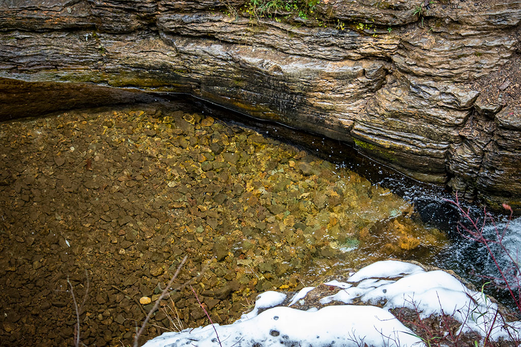 I hiked on and finally reached the Devil’s Bathtub. Actually, I hiked past it at first because I thought if I stopped, I would freeze. I kept going because I thought the Devil’s Bathtub would be a deep rocky pool, where people could dive off the cliffs into the cool refreshing water. The main pool was only a few feet deep, maybe 4 feet deep in another pool. Maybe not a good idea to dive into that I guess. Again, maybe at certain times of the year a person could jump in when the creek is flowing better. In the hot summer months, wading around in the pool sounds refreshing.