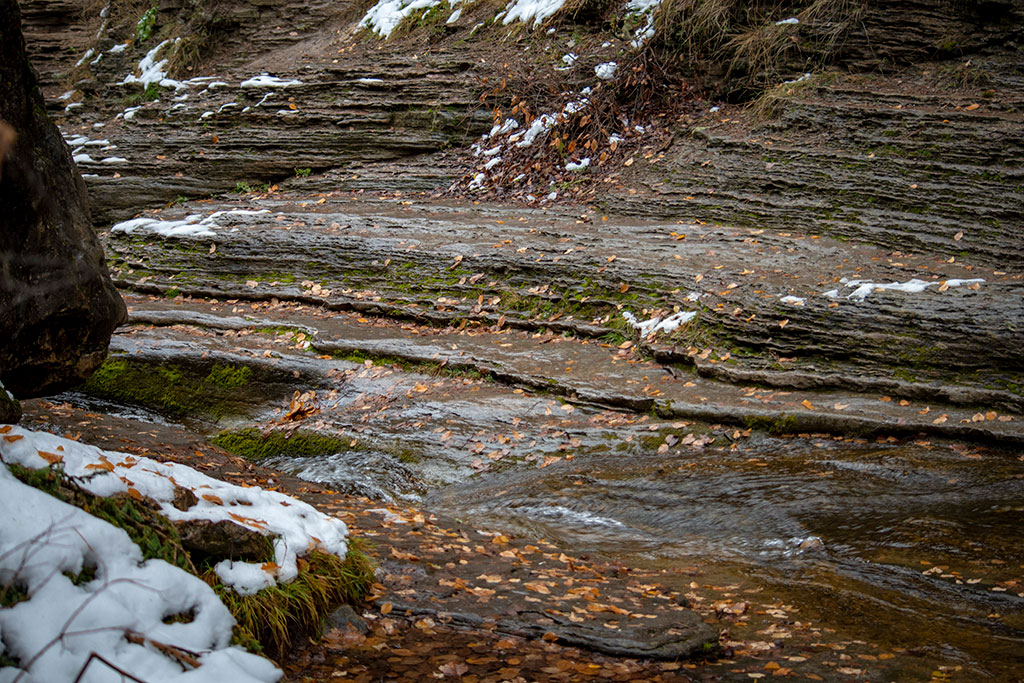 As you hike further into the canyon the creek flows over solid rock that has been worn smooth over “billions” of years. The canyon walls almost have a layered look, where the creek eroded away the rock creating jagged shelves. It was at this point in the hike where my dry clothes become wet. It looked innocent enough, but I miscalculated the wet rock, the wet leaves and probably the layer of slippery moss and I slipped while stepping across the creek. The horrible part was that it was so slippery I absolutely couldn’t get my footing to get back out! I started to slide down the creek like I was on a slippery slide from Hell. I was finally able to pull myself up and out of the creek, but the entire right side of my body was wet, along with both my shoes. Even though it’s only 35 degrees, as you keep hiking your wet, cold feet start to warm up very nicely.