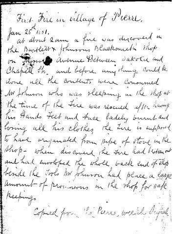 At about 2 am a fire was discovered in the Bartlett & Johnsons Blacksmith shop on Missouri avenue between Dakota and Chapelle St. and before anything could be done all the contents were ??? and Johnson who was sleeping in the shop at the time of the fire was rescued after having his hands, feet, and face badly burned and burning all his clothes. The fire is supposed to have originated from pipe of stove in the shop. When discovered the fire had ???? and had enveloped the whole back end of shop behind the tools Mr. Johnson had place a large amount of provisions in the shop for safe keeping.