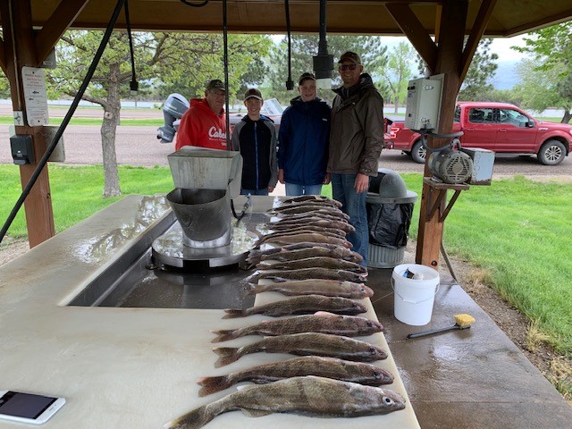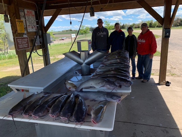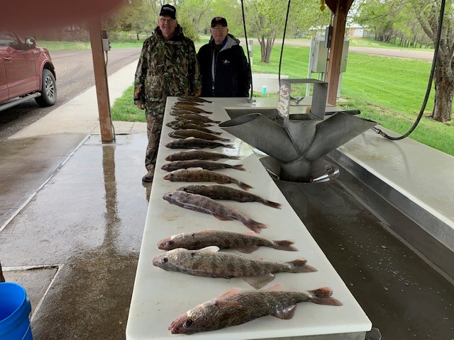 WEATHER is still a big factor in the fishing reports as spring days have been filled with a lot of rain and wind. On the days that are nice lots of fish coming in but on rain wind days catches can be limited. Generally speaking limits of eating size walleye and bass and catfish are normal for the good anglers on Sharpe. Pierre down to West Bend is all good but the stretch between antelope creek and Joe creek on Sharpe is muddy waters due to 6 inches above normal rainfall. Water temps are now in the 50’s on both lakes so fishing is getting better all up and down the system. I have been guiding mostly repeat customers and on the days weather cooperates mostly limits of walleye bass catfish and some northern.On Sharpe the spawn is generally over and the female walleye are active now so getting fish over 15 inches is much easier. Most of the fish are being caught in 10 fow or less on both minnows and crawler/ bouncer rigs along with jigs and pulling plugs working. On Oahe water surface temps in the 50’s are happening making really good catfishing with northern pike going well also. So far not a lot of big catch’s of walleye that I know of but with water warming and access to the boat ramps with roads drying up I expect that should change daily. I mentioned catfishing so I will make a couple of comments about probably one of the most under-fished species on Oahe. Over the years I have used Northern/catfishing as a way to beat the weather as you can get back up most feeder creeks stay out of the wind and in the spring catch lots of these. They are good eating, fight better than many other fish and the limit on catfish is as many as you want to clean on Oahe. I use smelt/slip bobbers in 5 fow or less and over the years I now have many of my repeat customers that tell me that even if the weather is good they want to spend a day chasing the catfish.Just a great bonus to take home a long with walleye/bass limits. If you look at some of the pictures of my customers you will see the size and numbers of these fish we have been catching and if you look real close the smiles on my customers faces. Repeat business is what has kept me guiding for over 30 some years now and catches of northern pike and catfish surprisingly is one of the reasons many of my repeats come back. Walleye are the king for sure but if you have overlooked a catfish day you might get a real pleasant surprise both catching them and eating them. Another reason is I hardly ever see another boat in the back of most creeks. Those without access to a boat can bank fish for both the northern and catfish so these are just examples of the pluses of having a lake full of fish like these.There are some salmon being caught but I really haven’t heard of big catches. We actually caught a few Atlantic salmon by accident (recently stocked) on Sharpe that have evidently went thru the intakes. The flys and bugs are starting to arrive a long with occasional sun shine so a good insect repellent along with sunscreen are boat items.