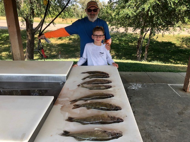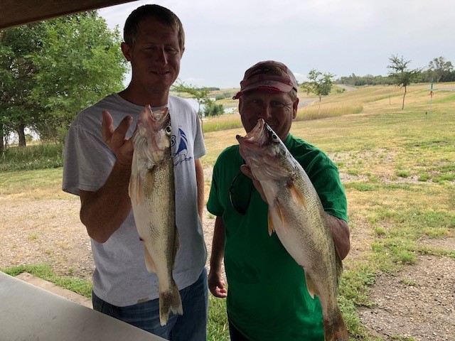 I think in some areas you can catch the walleye’s shallower than fifty feet of water as some fish have started to move up or were shallow all along. I spent some time fishing in around 14 fow to 20 fow and caught plenty of fish. Also saw a lot of small mouth bass in those depths so right now there are fish scattered in many depths. This also makes the hunting a little harder with some fish still in deeper depths and some coming up. I guided some fellows for the Outpost Lodge to limits of walleye and some big catfish then took John Bdzil and his grandson fishing getting limits and spent two days with another of my favorite repeat customers Audrey and Marv Finn from over Sundance, Wyoming way. In all cases they went home with their possession limits but a few of these days we spent time looking for fish and it also seemed like the bite got tougher after noon. Most of the time we caught these fish on nightcrawler plain hook rigs fishing way down on Oahe but when I fished the West Bend area the fish were around 10 fow out to 30 fow mostly on ridge lines or humps. Had a few days on Oahe coming in with some real nice overs to 24 inches and some big catfish to 10 lbs so there are plenty of bigger fish around if you land in spots that have some of those year class fish. Sharpe around west bend is still putting out limits of eater size walleye with good numbers of fish coming in. Baits and methods vary with pulling plugs/snap weights deep to minnows/leeches/crawlers on bouncer rigs all catching fish.  It is for sure summer with temps getting up there some days so lots of water/gator aide drinks are essential. Plenty of bug spray and sun screen help out and if you are going out in shorts it is a very good idea to throw a pair of long pants/sweat pants in the boat. You will appreciate them if the biting fly’s show up.