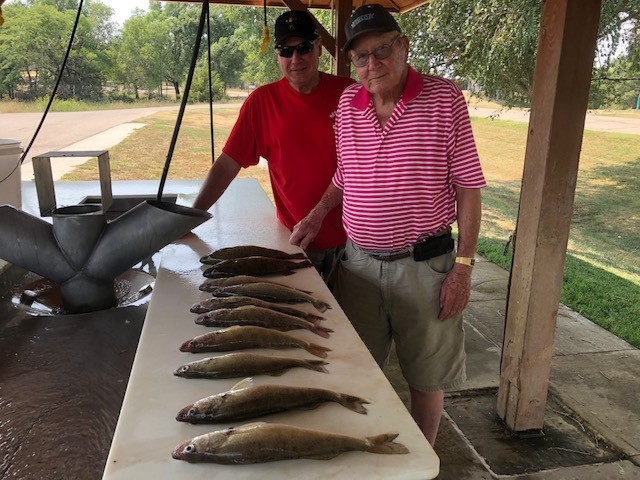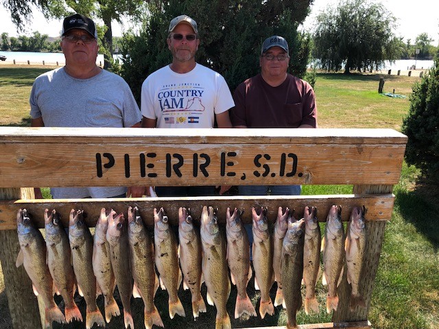 Fishing around Pierre has been generally good for the good fishermen. The river below Pierre has been putting out limits of over 15 inch fish when the conditions are right but can be harder when either not enough or to much current along with dirty water caused by wind/heavy current are present. Since the 15 inch minimum on September 1st started West Bend has been much tougher. The main presentations on Sharpe still seem to be either nightcrawler spinner rigs or plain hook nightcrawler or minnow rigs however pulling shallow running plugs works except when the wind causes lots of floating weeds. Oahe remains tougher because there are still walleyes in deep water and shallow water making finding them tougher. A bigger avg size walleye still is coming in on Oahe so if you can find them chances are you will have nicer stringers. I guided Steve Crawford and son then worked for the Outpost Lodge on the Channel Feeds repeat customer group (another great group that takes care of it’s customer/work force) and then took out another of my favorite bunch of repeat customers the Sederlin’s Steve and Doug along with Gary Simmons from Kansas. All of these groups went home with full possession limits of walleye along with some smallmouth bass and catfish. It is always an easy guide trip when I do guide trips with repeat customers and repeat business is what has made my guide business stay around for over 30 years. I also better attribute great fishing lakes to work on (Sharpe/Oahe) in that success..Weather will start to be more of a factor as fall approaches but cooler nights should bring the Oahe fish in more fishable depths improving the bite along with killing out some of the weed growth on Sharpe putting more of the fish out of the weeds making easier limit fishing. If you are coming to fish bring some warmer jackets etc. along now as you will be glad many mornings you did. Fly’s are still around so some days long pants are a better choice than Bermuda shorts if you do not want to spend time slapping them.