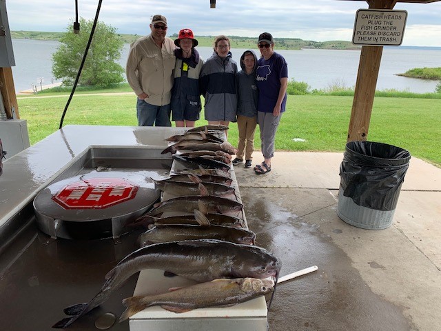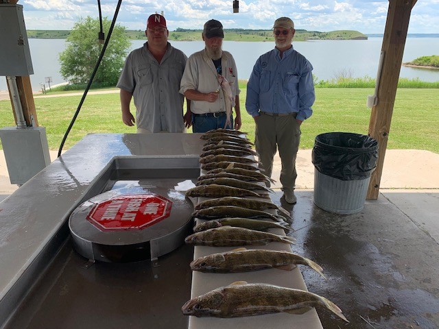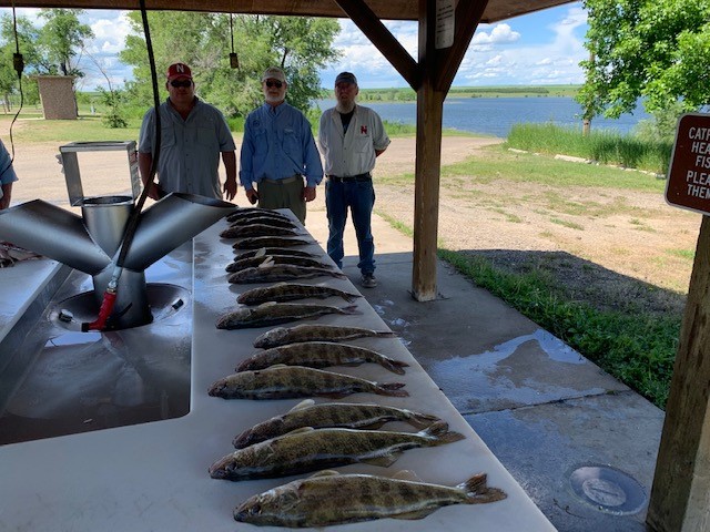 Except for a few wind days the weather has cooperated and so has the bite. I guided another of my repeat customer groups the Jay Wright, Sam, and Scott guys from around Genoa Ne to full possession limits of walleye some bass and catfish to take home along with big fish meals every night. The bite is very good all up and down the river. The overall avg size of walleye on Oahe is great with most bags coming in with some over 20 inch fish along with some 18 to 19 inchers. I am still fishing less than 6 fow but many boats are deeper catching walleye on Bouncer/Nightcrawler or leeches minnow rigs all the way out to 25 fow. Pulling plugs is also good. Sharpe is also good with limits for most boats. I favor Oahe however because the overall fish size is better along with bigger water that holds increased boat traffic. There are more and more anglers/boats out there every year enjoying the lakes so be prepared for busy boat ramps but with near record water high elevations there is plenty of room to fish. A full summer bite is going on from Chamberlain to Mobridge so take your pick and come on up and catch lots of fish.