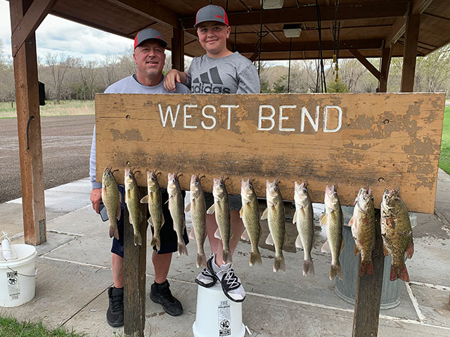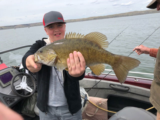 The bite is improving daily as water temps warm and run off water diminishes. The water clarity is getting better in many areas so fishing is also better. I guided repeat customers Dave Petrocco and son Dominic of Petrocco Farms from Denver for one day on Sharpe and day two in the Cheyenne river on Oahe. We got limits of eating size walleye and a lot of smallmouth bass on Sharpe on day one then went out on Oahe to target northern Pike as Dominic wanted to catch a big northern. We caught 4 northern in the 10 to 12 lb range and finally got one that was around 18 lbs so Dominic got a big one making the trip complete. We caught the walleye and bass on plug fishing using number 5 flicker shads in 6 fow or less but bouncer minnows /jigs minnows deeper are also working on Sharpe. The fish seem to be scattered so moving around a bit eventually produced limits for them. We also caught 20 or more bass as they are biting. Water temps are around 50 degrees on Sharpe as well as in the back of the Cheyenne however the walleye bite is much slower on Oahe. We caught the northern on smelt pike rigs in shallow water and also caught some smallmouth bass on plugs. I see these two every year and they are among my favorite repeat customers so we all had a great time. I will look forward to the next trip with them. It is raining today and looks like that is forecast for the next few days so spring weather is always a cross your fingers thing for these early trips. There were a lot of boats out over the weekend and that will increase so fishing in some areas can have crowded boat ramps. Lots of cabin fever around after this winter so it is great to be back on the water for many including me.