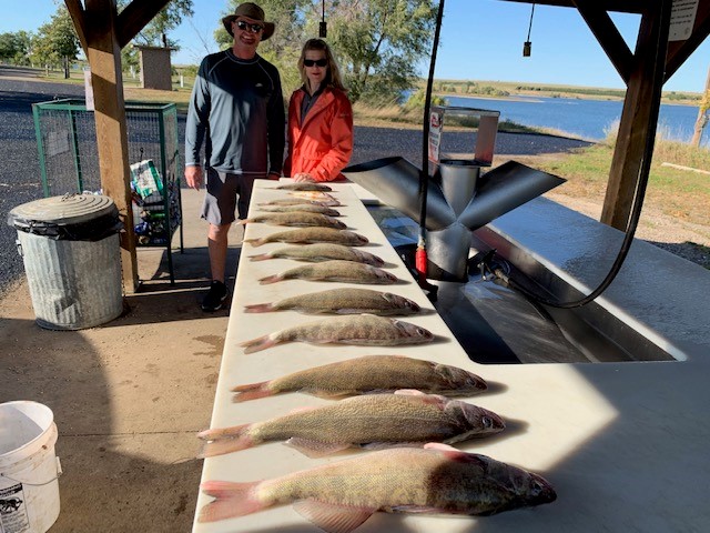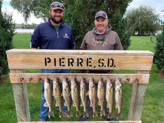 I have been having some days off and then doing a little hunting fishing hence not really keeping up with the reports like I usually do. Fishing has generally been good for both smallmouth and walleye on Oahe but tougher for the most part on Sharpe especially when they are running heavy current. I just finished guiding Scott Baily and his wife (friends of my fishing partner Larry Porter) from Lincoln Ne. for two days. The first day was in 20 to 40 mph winds so we just hung out below the dam with very little results. More a survival effort but day two the winds died and we got one of those beautiful fall days and got really nice fish on the big lake. We could have probably caught all the smallmouth we wanted but they were more interested in walleye so we did a little running and found some nice 15 inch to 20 inch walleye getting both their limits and mine. They were all real nice healthy fish coming from around 17 fow on nightcrawler/spinner/bouncer rigs but we did catch a few on minnows. A picture perfect day with as nice a couple as I could want and a really nice bunch of fish. Over all the bite has been good on Oahe with a lot of bigger fish being caught on a lot of different presentations but one that I will mention other than live bait is jigging spoons. For many of the guides jigging raps/spoons have been putting a lot of nice limits in the boat in depths deeper but recently down to 35 fow. The fishing season is starting to wind down now and hunting is beginning to take over center stage. There are plenty of birds on ranches that want them but some areas of public ground in the state are a little down. GF&PS put out info on the counts around the state so if hunting on public land it is good to see what areas are best. Lots of crops in the field due to lots of rain so that will be a big factor on season opener. I will still do a few more fishing reports but just about ready to hang things up for the year. If I don’t put out the info you need and you are coming later to fish feel free to give me a call and I will try and be helpful. Snow coming in this week so watch that as fishing could be real uncomfortable.