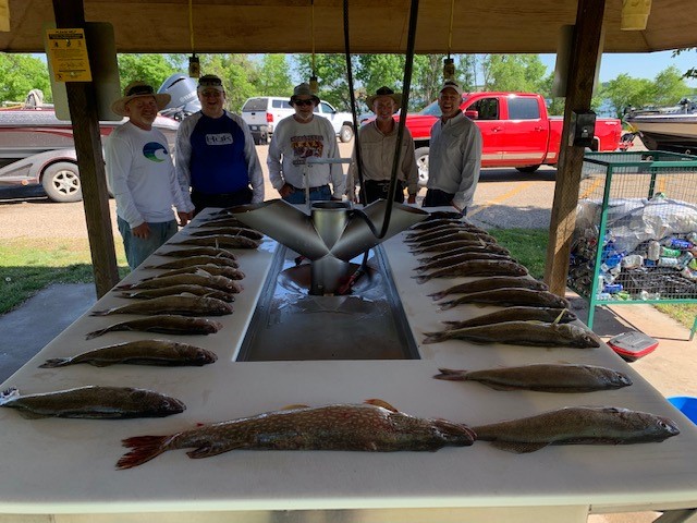 Just a great bite up and down the river with limits of walleye, bass, some northern pike and lots of catfish coming in for most anglers that have experience. Weather is still a factor and muddy water in some areas continue to make for tougher fishing but for the most part things are going very well. I fished the Davis group one of my repeat groups along with Mike Kulm helping guide and they just had great fishing taking home possession limits of Oahe walleye and smallmouth bass some northern pike and a lot of catfish. They also ate a lot of fish while they were here. We spent every day but one fishing Oahe and there is no doubt the quality of walleye and bass was there for this group with lots of 18 to 19 inch fish going home with them. We caught the walleye in around 6 fow or less using mostly crawler/bouncer rigs or pulling shallow plugs. Many boats are fishing deeper using minnow/bouncer rigs and leeches and that works also but most days we were throwing back nice walleye just looking for that big one fishing shallow. I do think that with some of this warmer weather there will be more days fishing in 10 fow to 25 fow will be the ticket for limit catches. The fish on Oahe are really nice healthy fat fish with over 20 inch fish more common than in recent years. I think the high water is helping the fishery in many ways and is very good for everything from bait fish to all species spawning and growing. It also makes a lot more water to fish and that is good because there is plenty of angler/boat traffic around and with so much water it gives everybody plenty of room. If you want to group fish you can but for those that like to find fish a way from boats that is great with the high water. . Taking lots of water/ gator aide type drinks is essential now with 80 degree days and bug repellent along with sun screen makes for better trips. A tip of the day for those that like to go out in shorts. Bring a long slip over long pants/sweat pants etc. just in case you end up in area with flies/bugs. You can be glad you did. Summer is here and so is the bite.