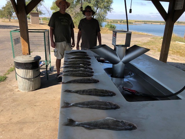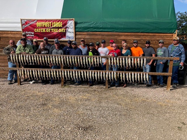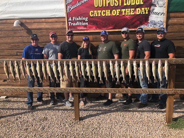 Not a lot of changes to report from my last post. The weather has stayed warm so lake temps remain close to the same. We need some 30 degree nights to cool the lake/river down to make any big difference in the bite. Sharpe continues to put out limits of over 15 inch walleye for most boats however the boat traffic especially on weekends is heavy. Oahe in areas is putting out limits for well informed fishermen and the traffic is much less. Some days maybe two boats in a 25 mile long run so if you are good at locating the walleye and you do not like to spend your trip in the middle of 20 boats it is the best choice . The fish bags can also have more 18 to 23 inch fish in them. Be aware though that it is a harder hunt than the river. Baits on Sharpe and Oahe still are either bouncer/crawlers or bouncer/minnows with jig minnows catching fish also. Pulling plugs is very good on Sharpe when the wind isn’t blowing weeds around. I along with other guide’s took out a real nice bunch of people with the Pioneer group ramrodded by Courtney then took two father sons customers and then did another of my favorite repeat customer groups NUTRENT AG SOLUTIONS ramrodded by Marty and Emma. Most of these guys/gal are from around the SIOUX CITY area and just a pleasure to guide. Limits were the norm and along with fish going home a big fish fry was enjoyed by all. The fish were all caught from 5 fow to 10 fow mostly on the above methods. Another company that takes the time to take care of their customer/employee’s in a great way both for them and all of the seven guides that they put on the water along with nice business for the OUTPOST LODGE. Thank you AG SOLUTIONS.