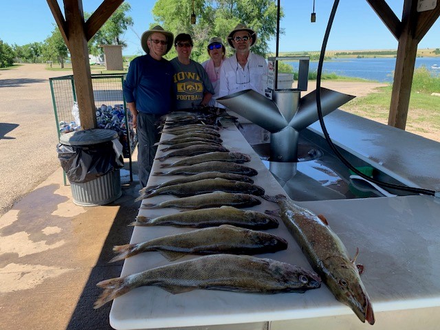 Just real good fishing going on all up and down both Oahe and Sharpe. I haven’t been fishing Sharpe but limits will get a lot easier after July 1st as the 15 inch minimum goes off until September 1st. Catching eating size fish should be good. Most of the reports I hear about Sharpe are spinners and crawlers in around 10 fow to 20 fow along the ledges at West Bend. Still plenty of boats out there especially on weekends. The same is true for Oahe. Be prepared to experience busy boat ramps but with all the high water on Oahe you can find plenty of places to fish that aren’t full of boats. I still am spending more time in 12 fow or less but fishing is going on successfully all the way out to 30 fow. My bait of choice is still nightcrawler rigs but leeches minnows and pulling plugs are all working. The big lake is really putting out nice fish this year with 18 and 19 inch fish in most bags. More northern are around and as usual smallmouth too. I took a very nice brothers and wives group, the Wilson’s fishing and they went home with full possession limits of walleye some catfish and northern . Great folks from around the Omaha Ne area. It looks like some hot days ahead with 90 degree days so water and Gatorade etc. are just essential to any outing. Bug spray and sunscreen are a plus in every boat. Every year I mention that you do not have to group fish as almost always you will have bigger and more fish finding spots that are not community spots plus the art of hunting down the fish instead of hunting for other boats is really a big part of the fishing sport. Most guys like me that have been on the water for years love the hunt as much as or more than the catching and eating.