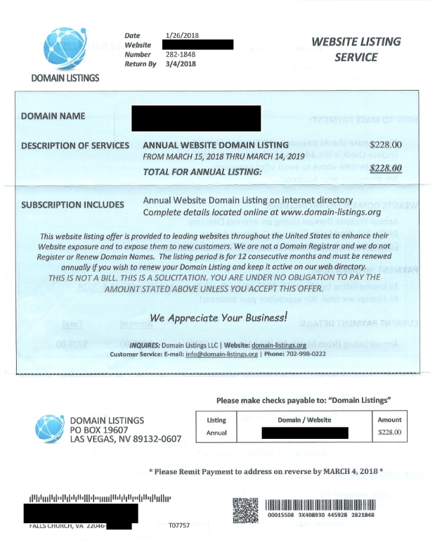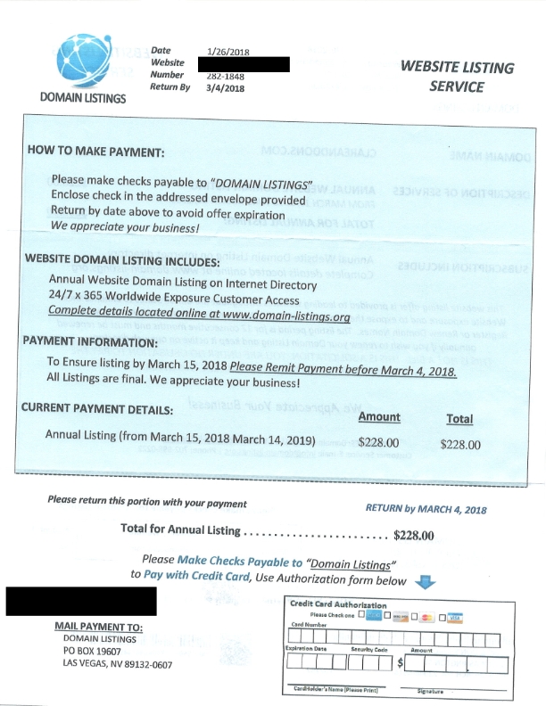 A client received the domain name scam below last week. This solicitation is similar to scams targeting trademark owners – it looks official and it is has zero legitimate value. An “Annual Website Domain Listing on internet directory” — so what? No one uses or needs such directories (unless they are selling spots for money). The cost of $228.00 provides no actual value that I am aware of.